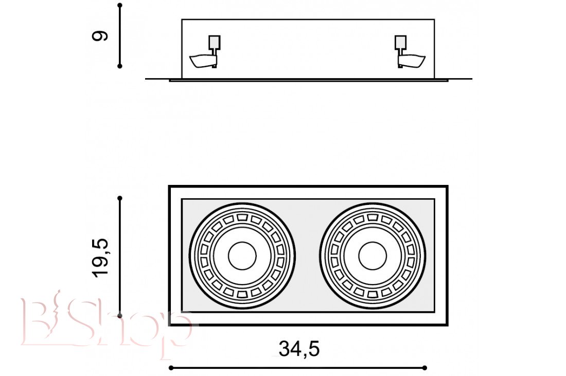 Количество ламп: 2. Тип цоколя: GU10. Ширина (см): 19.5. Мощность лампы (Вт): 50. Длина (см): 34.5. Глубина врезки (см): 9.