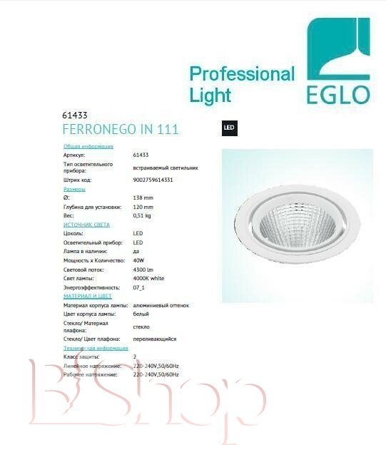 Количество ламп: 1. Тип цоколя: LED. Мощность лампы (Вт): 40. Диаметр (см): 13.8. Глубина врезки (см): 12.