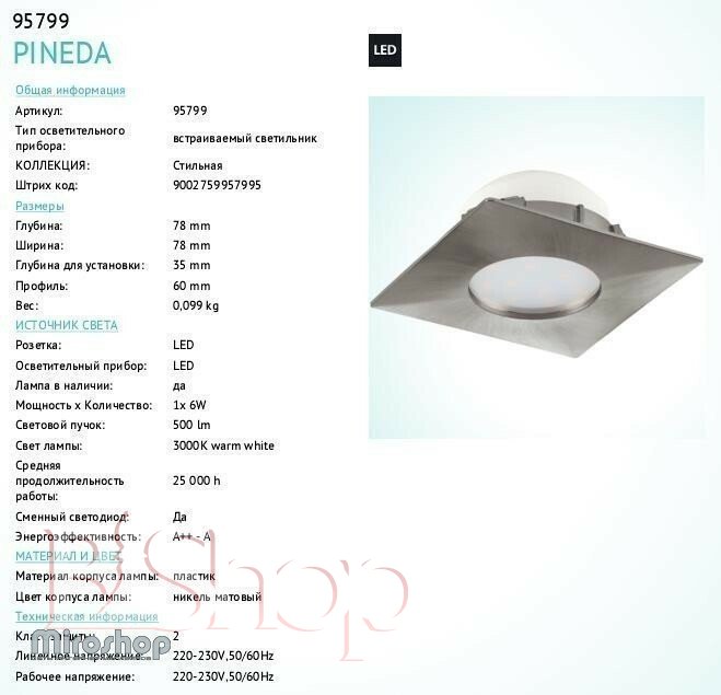Количество ламп: 1. Тип цоколя: LED. Ширина (см): 7.8. Мощность лампы (Вт): 6. Длина (см): 7.8. Глубина врезки (см): 3.5. Размер врезного отверстия (см): 6x6.