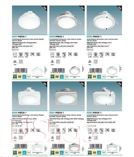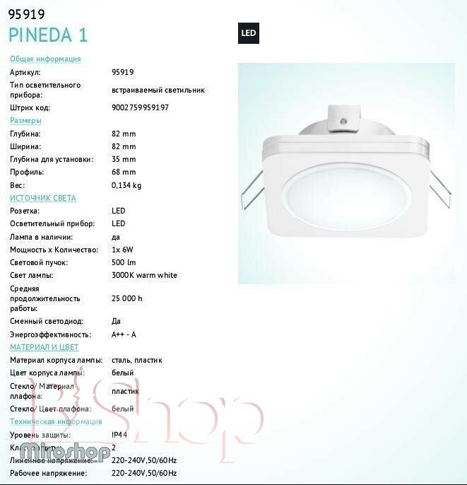 Количество ламп: 1. Тип цоколя: LED. Ширина (см): 8.2. Мощность лампы (Вт): 6. Длина (см): 8.2. Глубина врезки (см): 3.5. Размер врезного отверстия (см): 6.8x6.8.
