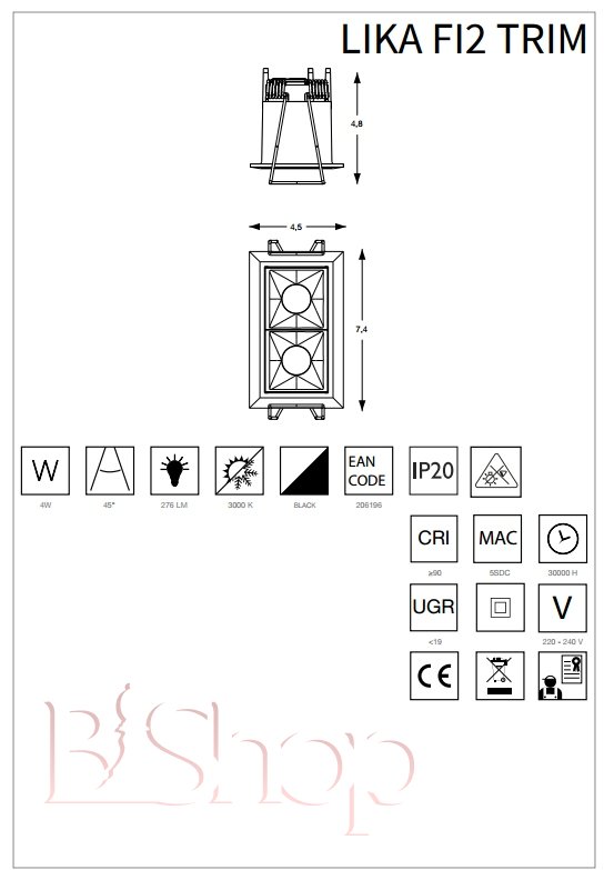 Количество ламп: 2. Тип цоколя: LED. Ширина (см): 4.5. Мощность лампы (Вт): 2. Длина (см): 7.4. Глубина врезки (см): 4.8. Размер врезного отверстия (см): 3.7х6.8.