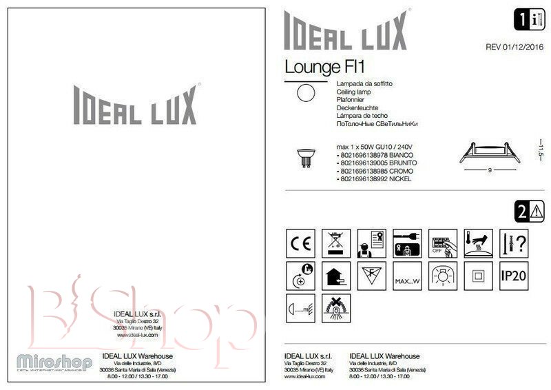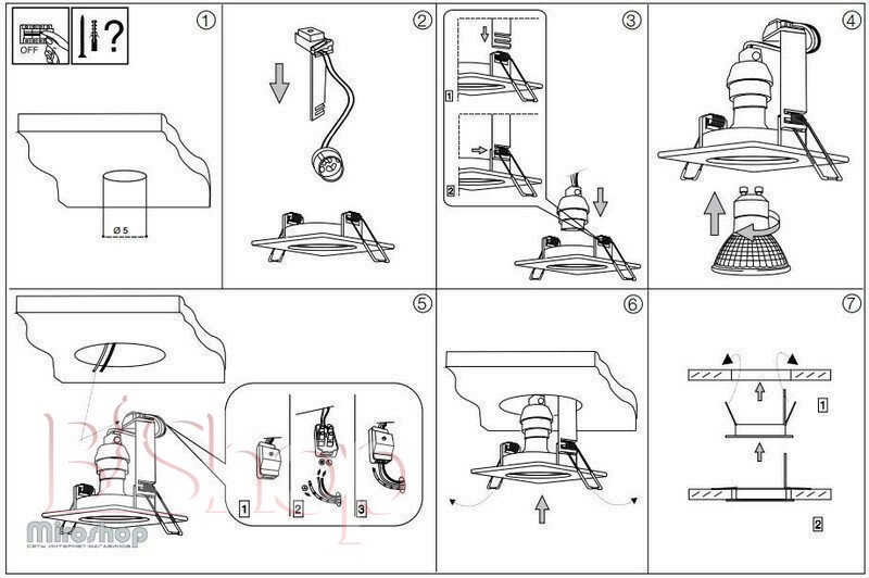 Количество ламп: 1. Тип цоколя: GU10. Ширина (см): 9. Мощность лампы (Вт): 50. Длина (см): 9. Глубина врезки (см): 9.5. Размер врезного отверстия (см): 6.7.