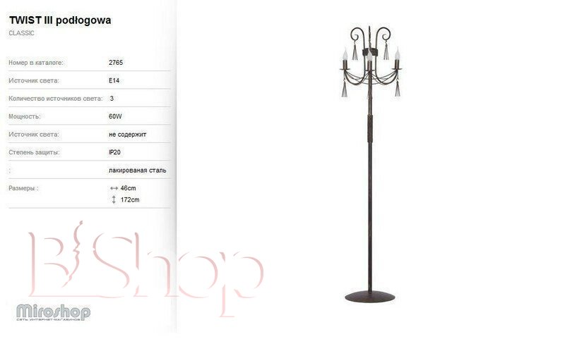 Количество ламп: 3. Тип цоколя: E14. Высота (см): 172. Ширина (см): 46. Мощность лампы (Вт): 60.