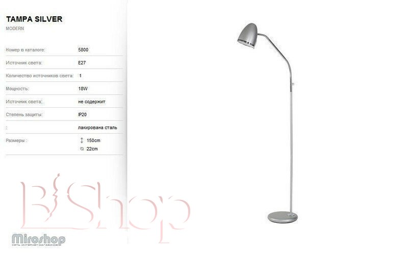 Количество ламп: 1. Тип цоколя: E27. Высота (см): 150. Мощность лампы (Вт): 18. Диаметр (см): 22.