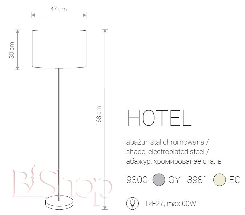 Количество ламп: 1. Тип цоколя: E27. Высота (см): 168. Мощность лампы (Вт): 60. Диаметр (см): 47.