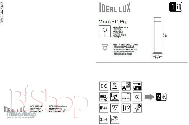 Уличный светильник Ideal Lux VENUS PT1 BIG ACCIAIO (089775) (67593)