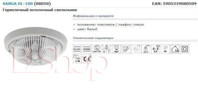 Количество ламп: 1. Тип цоколя: E27. Высота (см): 9. Мощность лампы (Вт): 100. Диаметр (см): 24.5.