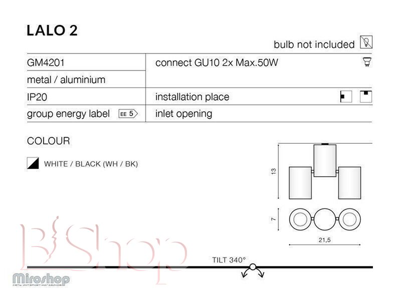 Кількість ламп: 2. Тип цоколя: GU10. Висота (див): 13. Ширина (див): 7. Потужність лампи (Вт): 50. Довжина (див): 21.5.