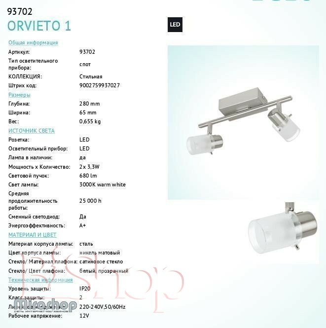 Кількість ламп: 2. Тип цоколя: LED. Ширина (див): 6.5. Потужність лампи (Вт): 3. Довжина (див): 28.