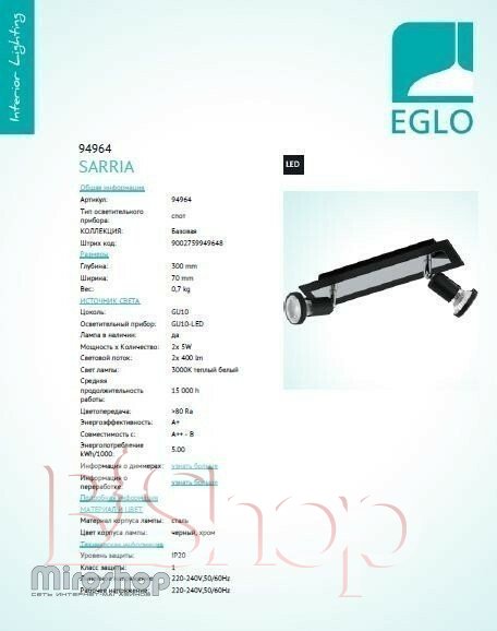 Кількість ламп: 2. Тип цоколя: GU10. Ширина (див): 7. Потужність лампи (Вт): 5. Довжина (див): 30.