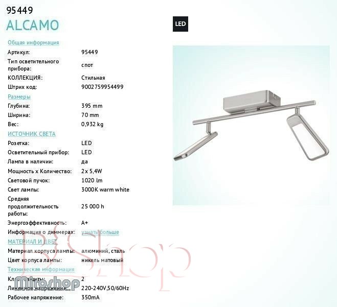 Кількість ламп: 2. Тип цоколя: LED. Висота (див): 7. Потужність лампи (Вт): 5.4. Довжина (див): 39.5.