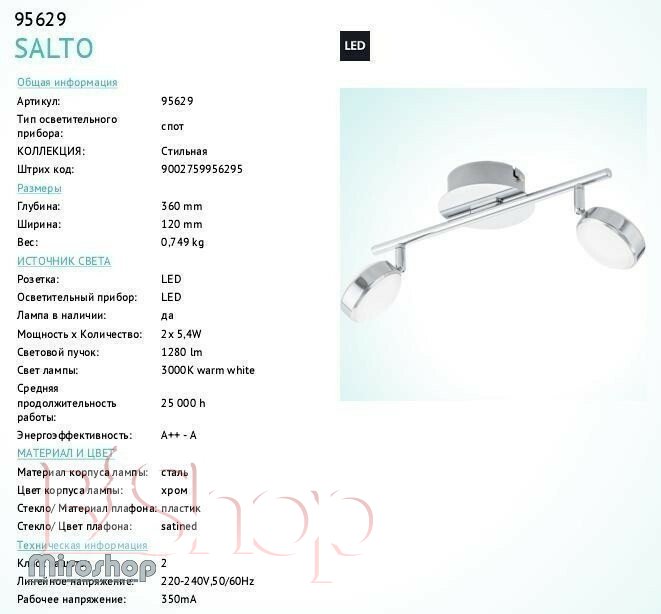 Кількість ламп: 2. Тип цоколя: LED. Ширина (див): 12. Потужність лампи (Вт): 5.4. Довжина (см): 36.