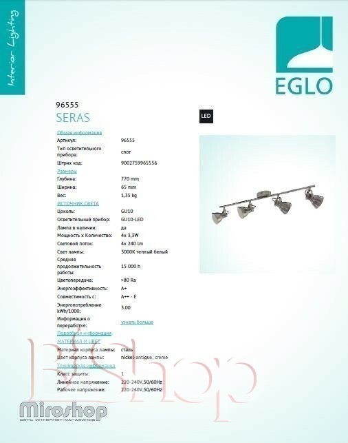 Кількість ламп: 4. Тип цоколя: GU10. Висота (див): 6.5. Потужність лампи (Вт): 3.3. Довжина (див): 77.