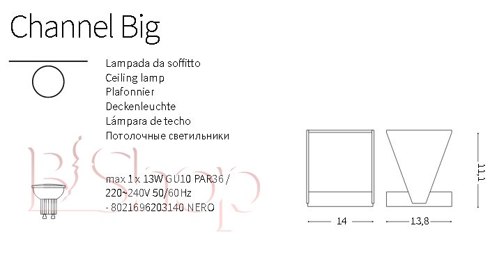 Кількість ламп: 1. Тип цоколя: GU10. Висота (див): 11. Ширина (див): 14. Потужність лампи (Вт): 13. Довжина (див): 14.