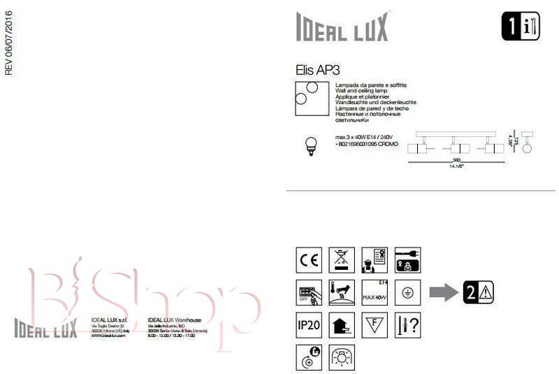 Кількість ламп: 3. Тип цоколя: E14. Висота (див): 13. Ширина (див): 6. Потужність лампи (Вт): 40. Довжина (див): 36.