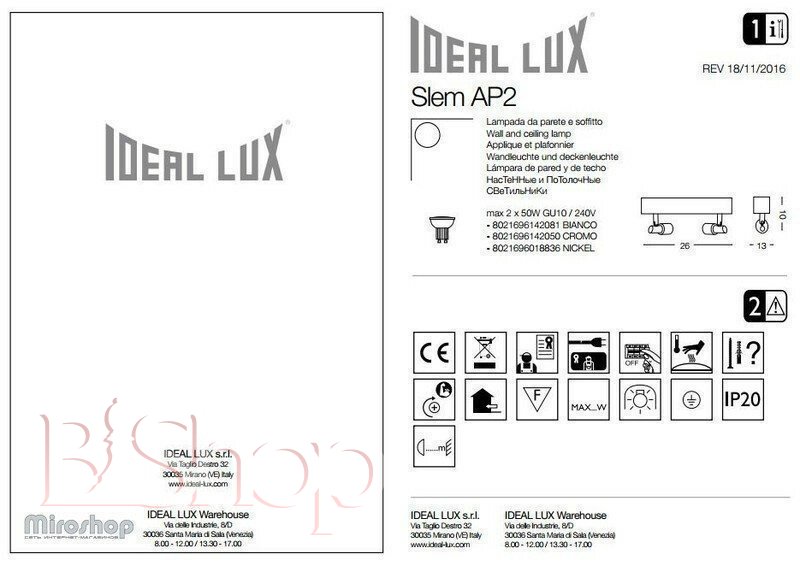 Кількість ламп: 2. Тип цоколя: GU10. Ширина (див): 10. Глибина (див): 13. Потужність лампи (Вт): 50. Довжина (див): 26.