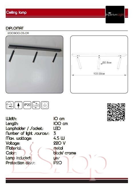 Кількість ламп: 3. Тип цоколя: LED. Висота (див): 10. Ширина (див): 100. Потужність лампи (Вт): 4.5.