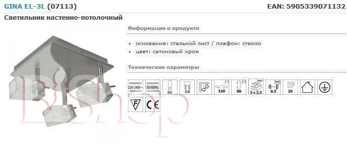 Кількість ламп: 3. Тип цоколя: G9. Висота (див): 8.5. Ширина (див): 20. Потужність лампи (Вт): 40. Довжина (див): 20.