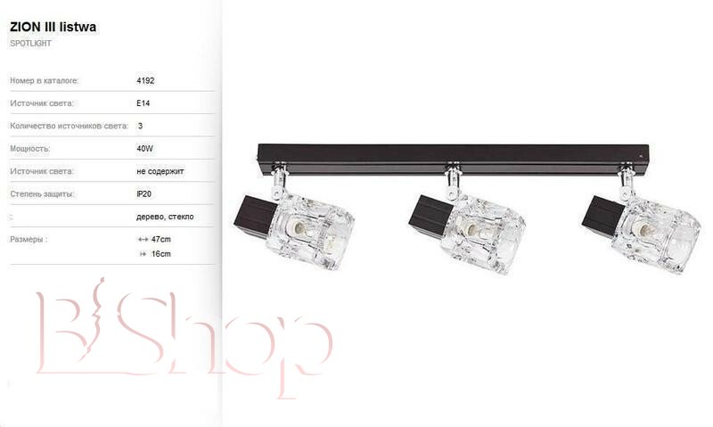 Кількість ламп: 3. Тип цоколя: E14. Ширина (див): 47. Глибина (див): 16. Потужність лампи (Вт): 40.