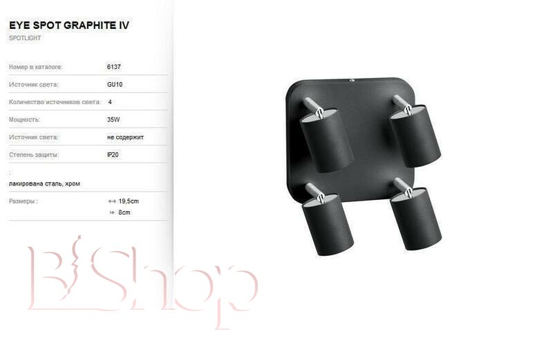 Кількість ламп: 4. Тип цоколя: GU10. Ширина (див): 19.5. Глибина (див): 8. Потужність лампи (Вт): 35.