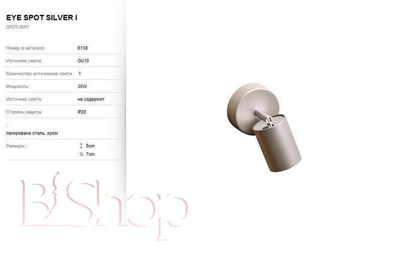 Кількість ламп: 1. Тип цоколя: GU10. Висота (див): 8. Потужність лампи (Вт): 35. Діаметр (див): 7.