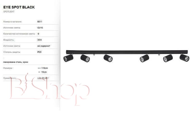 Кількість ламп: 6. Тип цоколя: GU10. Ширина (див): 119. Глибина (див): 10. Потужність лампи (Вт): 35.