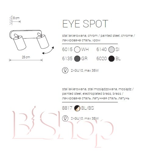 Кількість ламп: 2. Тип цоколя: GU10. Ширина (див): 25. Глибина (див): 8. Потужність лампи (Вт): 35.