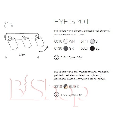 Кількість ламп: 3. Тип цоколя: GU10. Ширина (див): 33. Глибина (див): 8. Потужність лампи (Вт): 35.