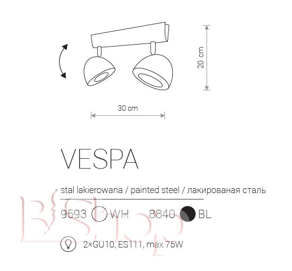 Кількість ламп: 2. Тип цоколя: GU10. Висота (див): 20. Потужність лампи (Вт): 75. Довжина (див): 30.