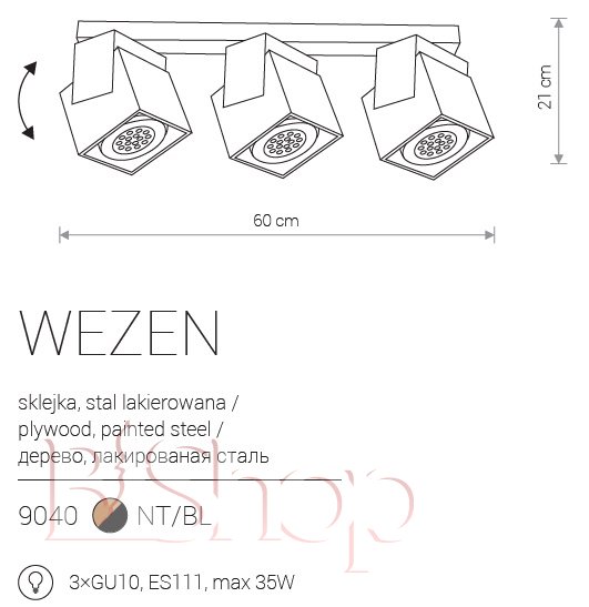Кількість ламп: 3. Тип цоколя: GU10. Висота (див): 21. Потужність лампи (Вт): 35. Довжина (див): 60.