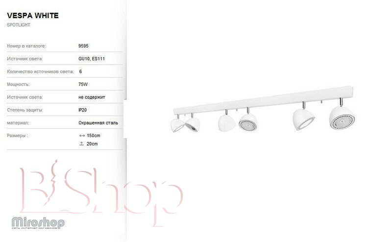 Кількість ламп: 6. Тип цоколя: GU10. Висота (див): 20. Потужність лампи (Вт): 75. Довжина (див): 150.