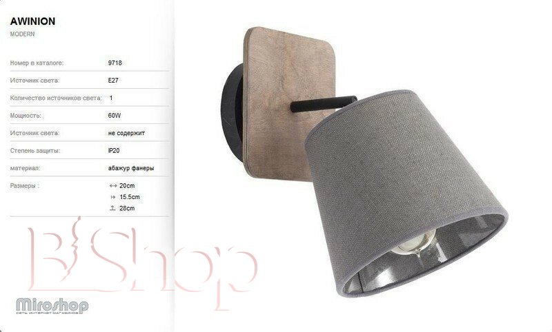 Кількість ламп: 1. Тип цоколя: E27. Висота (див): 28. Потужність лампи (Вт): 60. Діаметр (див): 18. Довжина (див): 20.