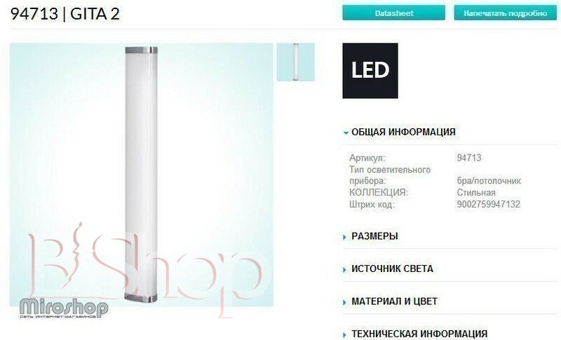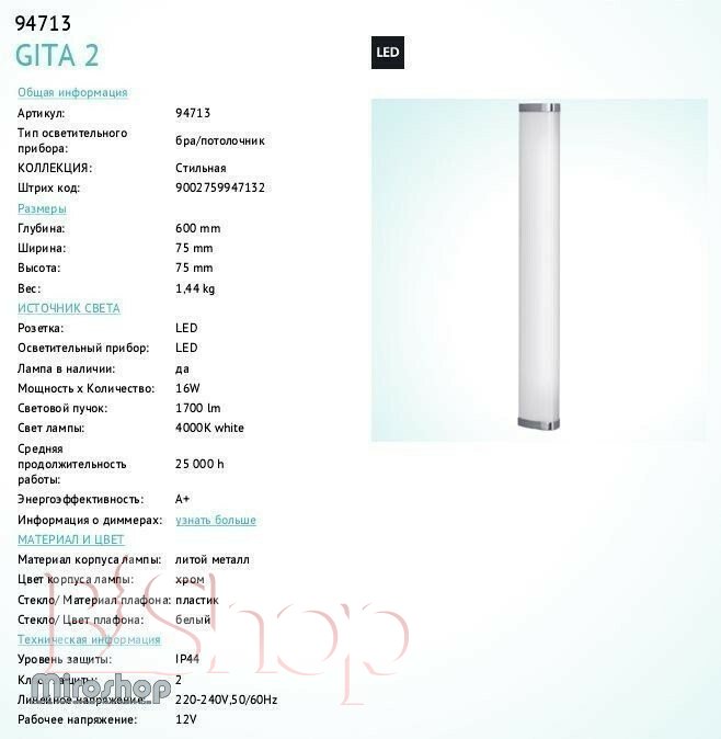 Кількість ламп: 1. Тип цоколя: LED. Висота (див): 7.5. Глибина (див): 7.5. Потужність лампи (Вт): 16. Довжина (див): 60.