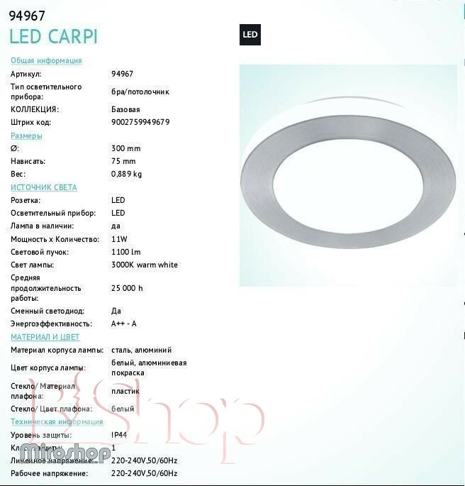 Кількість ламп: 1. Тип цоколя: LED. Висота (див): 7.5. Потужність лампи (Вт): 11. Діаметр (див): 30.