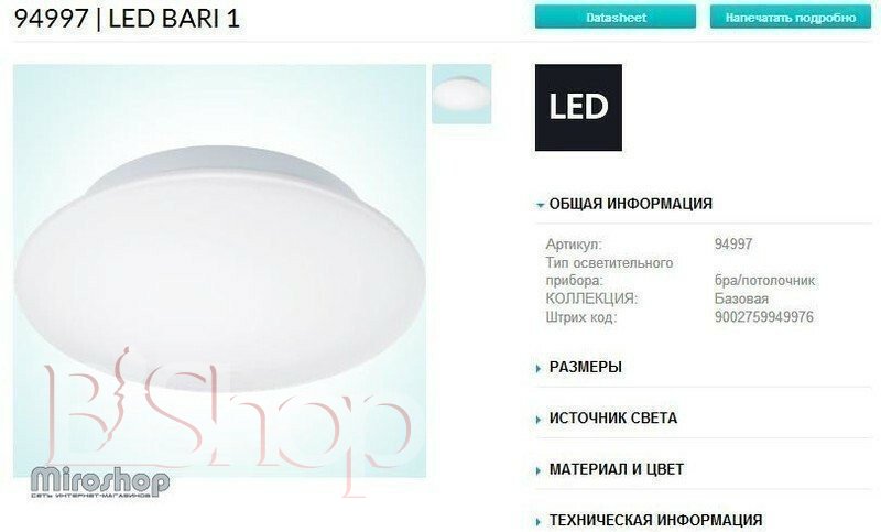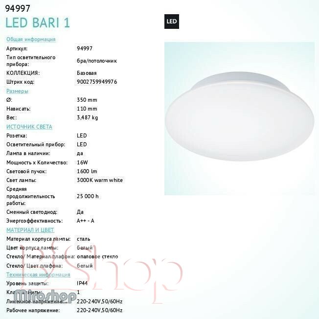 Кількість ламп: 1. Тип цоколя: LED. Висота (див): 11. Потужність лампи (Вт): 16. Діаметр (див): 35.