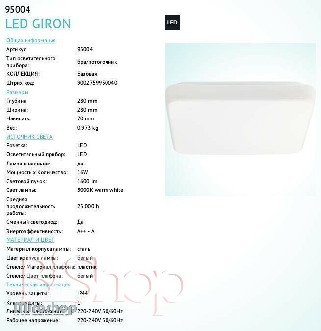Кількість ламп: 1. Тип цоколя: LED. Висота (див): 7. Ширина (див): 28. Потужність лампи (Вт): 16. Довжина (див): 28.