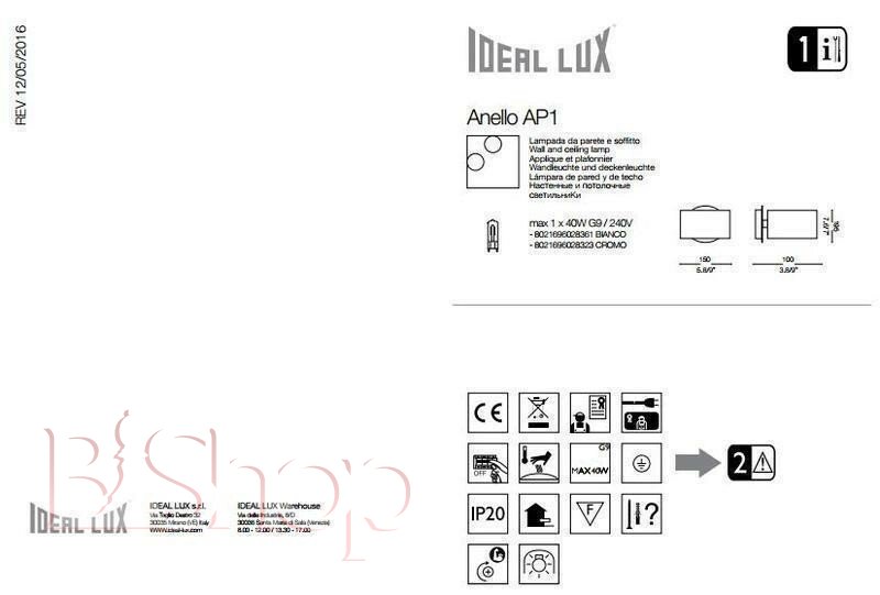 Кількість ламп: 1. Тип цоколя: G9. Висота (див): 20. Ширина (див): 10. Потужність лампи (Вт): 40. Довжина (див): 16.