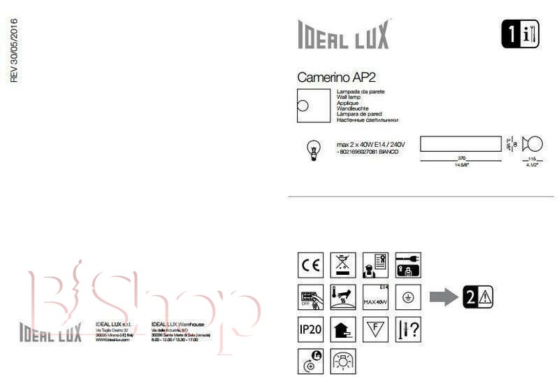 Кількість ламп: 2. Тип цоколя: E14. Висота (див): 8. Потужність лампи (Вт): 40. Довжина (див): 37.