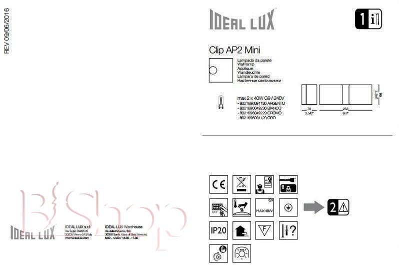 Кількість ламп: 2. Тип цоколя: G9. Висота (див): 9. Ширина (див): 8. Потужність лампи (Вт): 40. Довжина (см): 25.