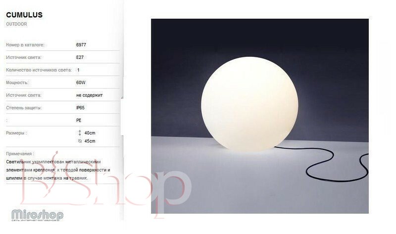 Кількість ламп: 1. Тип цоколя: E27. Висота (див): 40. Потужність лампи (Вт): 60. Діаметр (див): 45.