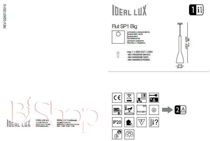 Кількість ламп: 1. Тип цоколя: E27. Висота (див): 112. Потужність лампи (Вт): 60. Діаметр (див): 15.
