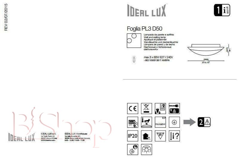 Кількість ламп: 3. Тип цоколя: E27. Висота (див): 14. Потужність лампи (Вт): 60. Діаметр (див): 50.