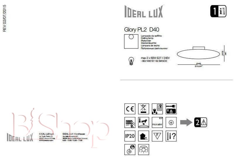 Кількість ламп: 2. Тип цоколя: E27. Висота (див): 15. Потужність лампи (Вт): 60. Діаметр (див): 40.