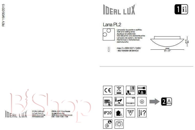Кількість ламп: 2. Тип цоколя: E27. Висота (див): 10. Потужність лампи (Вт): 60. Діаметр (див): 30.