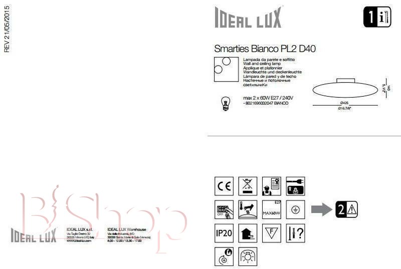 Кількість ламп: 2. Тип цоколя: E27. Висота (див): 14. Потужність лампи (Вт): 60. Діаметр (см): 43.