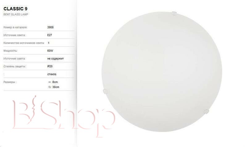 Кількість ламп: 1. Тип цоколя: E27. Глибина (див): 8. Потужність лампи (Вт): 60. Діаметр (див): 30.