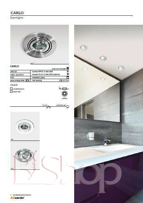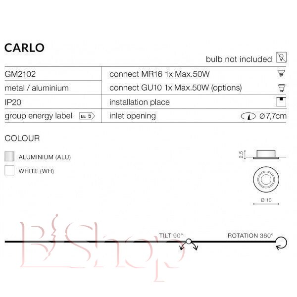 Кількість ламп: 1. Тип цоколя: GU10. Висота (див): 2.5. Потужність лампи (Вт): 50. Діаметр (див): 10. Розмір урізного отвору (див): 7.7.