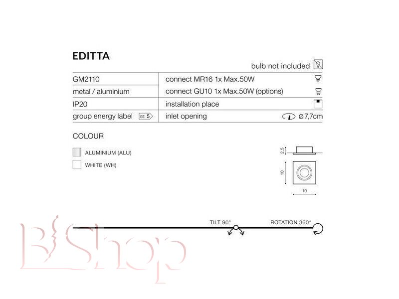 Кількість ламп: 1. Тип цоколя: GU10. Висота (див): 2.5. Ширина (див): 10. Потужність лампи (Вт): 50. Довжина (див): 10.