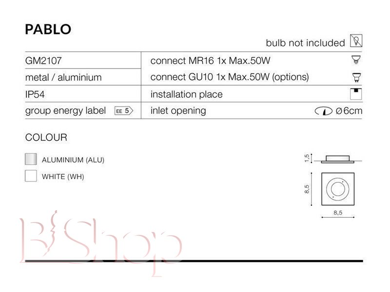 Кількість ламп: 1. Тип цоколя: GU10. Ширина (див): 8.5. Потужність лампи (Вт): 50. Довжина (див): 8.5. Глибина урізання (див): 1.5. Розмір урізного отвору (див): 6.