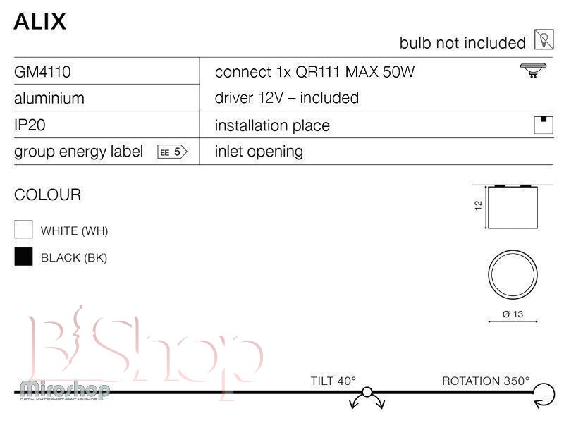 Кількість ламп: 1. Тип цоколя: G53. Висота (див): 12. Потужність лампи (Вт): 50. Діаметр (див): 13.